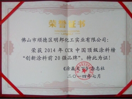 7月7日,“2014年CCR中國頂級涂料排行榜發布暨中國涂料營銷峰會”在順德舉行,同期還發布了民用涂料、家具涂料、水性木器漆、兒童漆、防水涂料、硅藻泥等多個子榜單,其中明邦化工榮獲了2014年CCR中國頂級涂料榜,“創新涂料錢20強品牌”榮譽稱號。